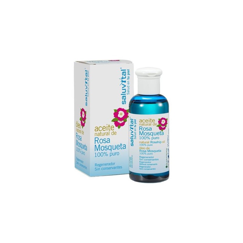 El Aceite Puro de Rosa Mosqueta Saluvital, obtenido por primera presión en frío, presenta un elevado contenido en ácidos grasos esenciales, aproximadamente un 80 % de su composición, que le confieren excelentes propiedades regeneradoras. Tambien contiene carotina, flavonoides, y vitamina C, así como tretinoina natural, un derivado del retinol (vitamina A), que estimula la regeneración del tejido epidérmico. Atenúa cicatrices, estrías y arrugas, previene el envejecimiento prematuro de la piel y difumina las manchas de la misma.