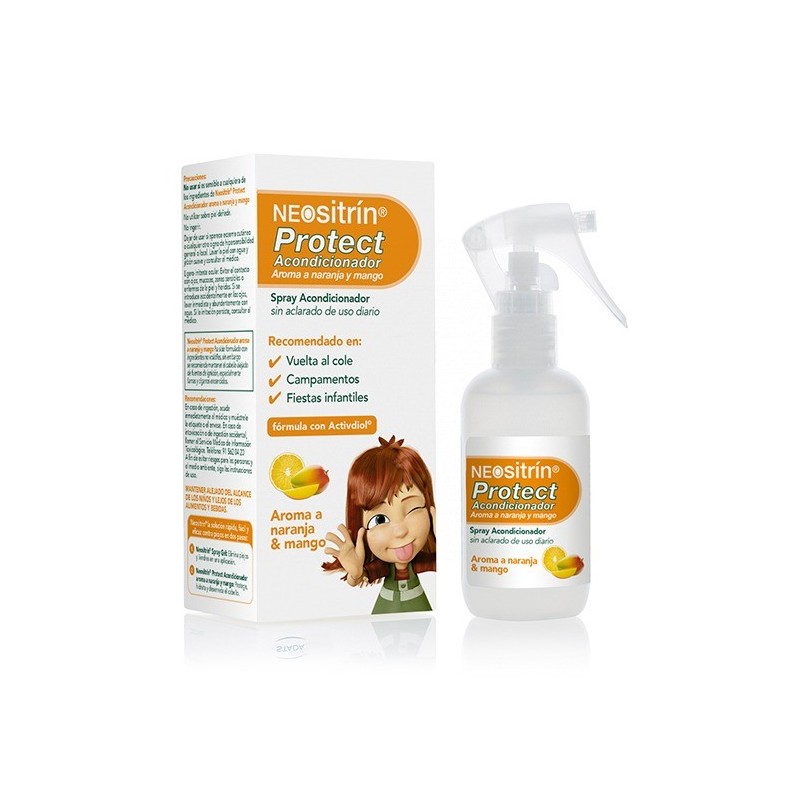 Neositrín®Protect es un spray acondicionador de uso diario que te permite conseguir un pelo desenredado y protegido sin aclarar. Eliminando los piojos que puedan entrar en contacto con el cabello.