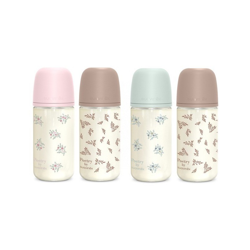 Biberones de vidrio de 240ml de la colección poetry con tetina fisiológica sx pro de flujo medio. Estos biberones son de cristal y están fabricados en vidrio 100% reciclable. No absorben ni los olores ni los sabores. ¡la opción más sostenible! la tetina sx pro de flujo medio, recomendada para todos los líquidos de densidad media y puede utilizarse con la leche, los zumos o el agua.