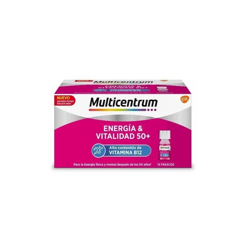 Multicentrum Energía & Vitalidad 50+ es un complemento alimenticio para adultos mayores de 50 años con un alto contenido de vitamina B12, Niacina y Zinc.