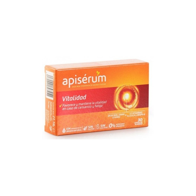 Apisérum Vitalidad 30 cápsulas es un complemento alimenticio con 1500mg de jalea real de la máxima calidad (2%HDA garantizado) y 12 vitaminas que te ayudan a disminuir el cansancio y la fatiga y contribuyen al funcionamiento normal del sistema inmunitario. Su exclusiva fórmula te ayuda a mantener tu estilo de vida con energía y vitalidad.