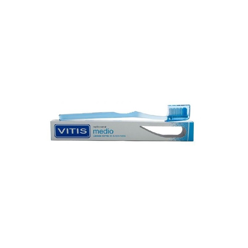 Vitis Medio es un cepillo de uso diario con un cabezal de forma diamantada que permite llegar a las zonas de difícil acceso de la cavidad bucal. Sus filamentos de dureza media y con perfil ondulado, acceden a los espacios interdentales, a la vez que facilitan la limpieza en el contorno de las encías.