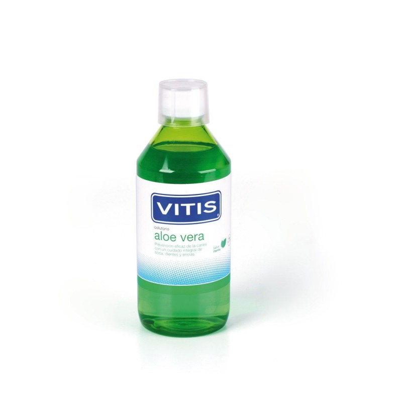 Vitis Aloe Vera Colutorio Sabor Menta es un enjuague bucal con efecto antiséptico que elimina el biofilm oral de la cavidad bucal, llegando a las zonas de difícil acceso, como las zonas posteriores. Su completa formulación contiene los principios activos necesarios para una higiene bucal óptima. Su uso diario proporciona cuidado integral de boca, dientes y encías dejando un agradable y refrescante sabor a menta.