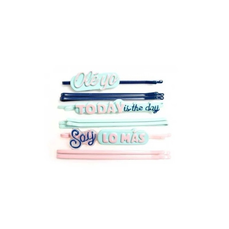 Kit compuesto por nueve horquillas para el pelo. Cuatro de ellas lisas, dos en negro y dos en rosa clarito. Y el resto con frases motivadores muy wonder: