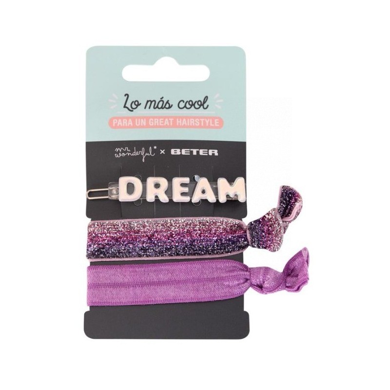 Está compuesto por un clip con el texto Dream y dos coleteros de nudo en tonos púrpura, uno de ellos con purpurina. Para no dejar nunca de soñar.