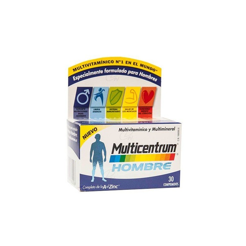 Complemento alimenticio a base de vitaminas y minerales, especialmente formulado para satisfacer las necesidades nutricionales de los hombres. MODO DE EMPLEO Tomar un comprimido al día. PRECAUCIONES Y ADVERTENCIAS Es importante mantener una dieta variada y equilibrada además de un estilo de vida saludable. Los complementos alimenticios no deben ser usados como sustitutos de una dieta equilibrada. Como medida de seguridad, el bote se encuentra sellado con una lámina de aluminio. No tome el producto si se encuentra dañada. En caso de sobredosis accidental, contacte inmediatamente con su médico o el Centro de Información Toxicológico. Si está tomando otros complementos, lea la composición dado que éstos pueden contener los mismos ingredientes. Después de cada uso, asegúrese de que el bote se encuentra cerrado y guardado dentro de su caja. Mantener fuera del alcance y de la vista de los niños. USO EN PACIENTES CON INTOLERANCIA ALIMENTARIA Este producto lo puede tomar una persona celíaca, alérgica/intolerante al huevo, alérgica a la proteína de leche o intolerante a la lactosa.