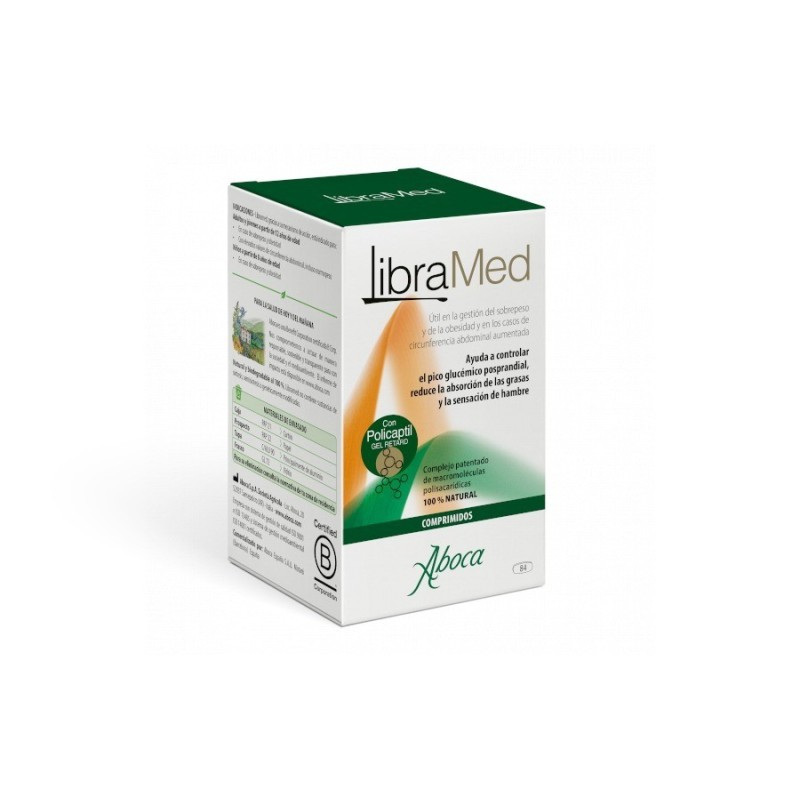 Libramed es un producto sanitario cuya eficacia y seguridad han sido clínicamente testadas y que favorece la reducción del peso corporal. Libramed controla los picos glucémicos después de las comidas, regulando la concentración de glucosa y de insulina en la sangre, que pasa a ser más constante, de esta forma se reduce la lipogénesis (acumulación de grasa en los adipocitos) y la sensación de hambre gracias a Policaptil Gel Retard®, 100 % natural. Modo de empleo comprimidos: adultos y adolescentes mayores de 12 anos: 3 comprimidos antes de las dos comidas principales. Niños de 8 a 12 años: 2 comprimidos antes de las dos comidas principales.